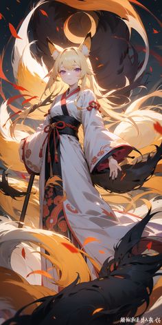 Características de Raça ⭢ Possuem orelhas de raposa e nove caudas. Também se transformar livremente em uma raposa ou permanecer na forma original. Eles costumam se alimentar da energia vital de seres vivos, ou de memorias. Um ano humano é equivalente a 30,4 dias para uma kitsune e elas são imortais perante a idade além de parar de envelhecer fisicamente aos 20.